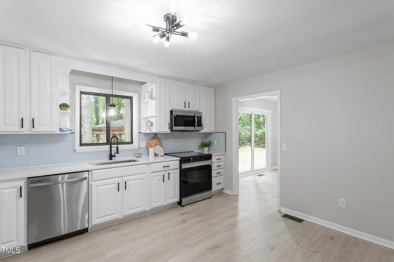 Gorgeous with a bright, open layout in great Durham location. Features laminate hardwood-style floors & a dreamy kitchen featuring quartz counters, white shaker cabinets, Stainless Steel appliances Upstairs: spacious primary suite with tiled shower Fenced backyard with gazebo—perfect for relaxing or entertaining. Fresh paint, modern finishes & easy access to Downtown Durham, RTP & RDU. This one's got the vibe. Staged photos for illustration only, to show homes potential.